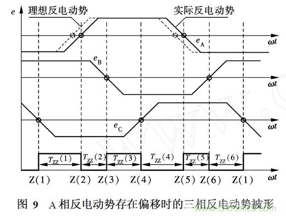 假設A 相反電動勢存在相位偏移, 波形上升和下降部分上的過零點滯后出現(xiàn),導致過零點在時間軸上分布不均勻. 如圖9所示, 虛線表示理想反電動勢,實線表示存在相位偏移的實際反電動勢,過零點的間隔時間TZZ (1) , TZZ ( 2)和TZZ ( 3)不相等. 每相反電動勢波形上升和下降部分的2個過零點相差180°電角度, 過零點間隔時間存在著周期性規(guī)律,如TZZ ( 1) =TZZ ( 4) , TZZ ( 2) = TZZ ( 5)和TZZ (3) = TZZ (6) .