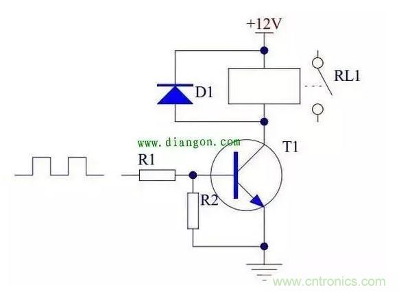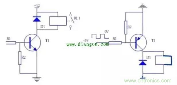 當(dāng)晶體管用來驅(qū)動繼電器時,必須將晶體管的發(fā)射極接地。具體電路如下: