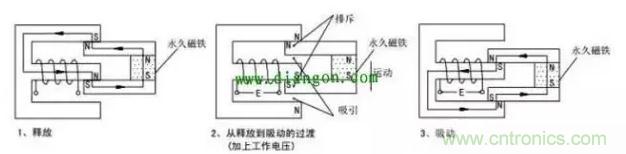 由永久磁鐵保持釋放狀態(tài),加上工作電壓后,電磁感應(yīng)使銜鐵與永久磁鐵產(chǎn)生吸引和排斥力矩,產(chǎn)生向下的運動,最后達到吸合狀態(tài)。