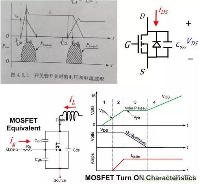 這里就用MOSFET代替BJT了,所以ids = ic,Vds=Vce,Coss也就是Cds代表輸出電容。簡單來說就是當(dāng)MOS管一開始導(dǎo)通時(shí)輸出電容Coss還保持Vds電壓,隨著Ids電流越來越大,Vds電壓終于保持不住,開始下降。直到管子完全開啟。比較詳細(xì)的開啟過程是由Miller Plateau造成的,這里借用了網(wǎng)上一些解釋Miller Plateau的圖,如果有不清楚的就請見諒了。