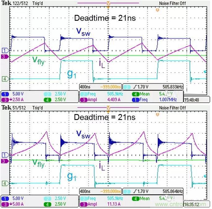 對于half bridge 實(shí)現(xiàn)ZVS turn on,我們希望當(dāng)上管Q1開啟時(shí)電流是流進(jìn)switching node (vsw)的,也就是圖中電感電流為負(fù)值,當(dāng)下管Q2開啟時(shí)我們希望電流是流出switching node (vsw)的,也就是電感電流為正值。為什么這樣就可以實(shí)現(xiàn)ZVS turn on了呢?我們就看上管Q1開啟過程。如果電感電流iL為負(fù),這時(shí)候我們先關(guān)閉Q2,這時(shí)候Q1還未開啟,在這個deadtime中iL會charge Q2的Coss,使Vsw抬高到Vin,當(dāng)然不能超過Vin,因?yàn)镼1的body diode會導(dǎo)通,鉗位住Vsw到Vin,這時(shí)候Q1的Vds就是Vin-Vsw=0,這時(shí)候我們開啟Q1就實(shí)現(xiàn)ZVS了。同理對于Q2開啟時(shí),如果電感電流為正,那么當(dāng)我們首先關(guān)閉Q1管時(shí),Vsw就會被電感電流拉低到0,因?yàn)閕L》0, Q2的Coss會discharged到0,然后我們再開啟Q2,就可以達(dá)到ZVS了。這里我有一張其他Topology的PWM converter的波形圖,也和buck工作原理類似,大概可以看看基本原理,也就是電感電流為負(fù)時(shí),Q1可以實(shí)現(xiàn)ZVS,讓Vsw的ringing比較小。而當(dāng)電感電流為正時(shí),實(shí)現(xiàn)不了ZVS,Vsw的ringing就比較大了。