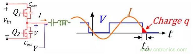 這是因?yàn)槿绻娏鱅是滯后與電壓V的,這樣在Q1開啟之前電流I為負(fù)值就會charge Q2的Coss,同時(shí)discharge Q1的Coss,讓V到Vin,這樣Q1就實(shí)現(xiàn)ZVS turn on了。Q2開啟之前,電流I為正,也會discharge Q2的Coss,和charge Q1的Coss,讓V到0,這樣Q2就實(shí)現(xiàn)ZVS了。