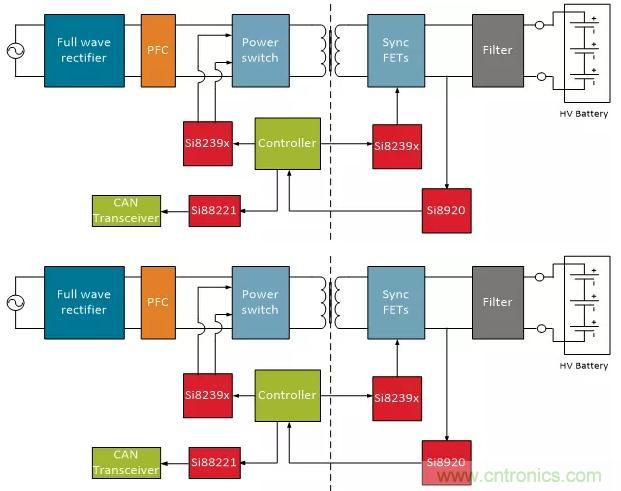 OBC系統(tǒng)采用交流輸入源,通過全波整流器將其轉(zhuǎn)換為高壓直流總線電壓,并提供功率因數(shù)校正(PFC)。產(chǎn)生的直流信號(hào)被斬波成開關(guān)方波,用于驅(qū)動(dòng)變壓器以產(chǎn)生所需的直流輸出電壓。輸入信號(hào)的斬波由隔離柵極驅(qū)動(dòng)器(例如Silicon Labs的Si8239x器件)完成。