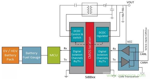 在圖3中,高壓域是電池組一側(cè),低壓域是CAN收發(fā)器一側(cè)。此示例主要關(guān)注CAN總線接口,但微控制器(MCU)和電池組本身之間可能有額外的隔離。