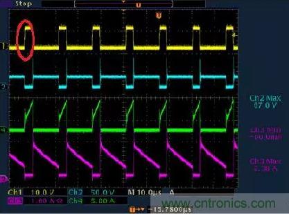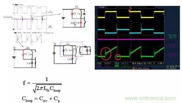 不管是在CCM模式還是DCM模式,在mosfet開通on時(shí)刻,變壓器副邊都有震蕩。主要原因是初次及之間的漏感+輸出肖特基(或快恢復(fù))結(jié)電容+輸出電容諧振引起,在CCM模式下與肖特基的反向恢復(fù)電流也一些關(guān)系。故一般在輸出肖特基上并聯(lián)-一個(gè)RC來吸收,使肖特基應(yīng)力減小。