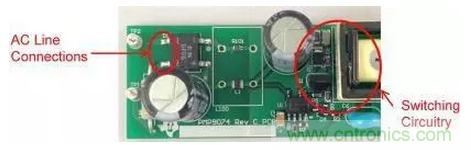 注意,漏極連接與輸入引線之間有一些由輸入電容器提供的屏蔽。該電容器的外殼連接至主接地,可為共模電流提供返回主接地的路徑。如圖2所示,這個(gè)微小的電容會(huì)導(dǎo)致電源EMI簽名超出規(guī)范要求。