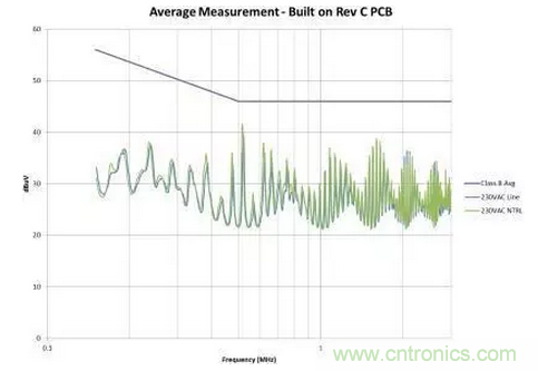 圖4是修改后的效果圖。我們?cè)诠收宵c(diǎn)位置為EMI規(guī)范獲得了大約6dB的裕量。此外,我們還顯著減少了總體EMI簽名。所有這些改善都僅僅是因?yàn)椴季值恼{(diào)整,并未改變電路。如果您的電路具有高電壓開關(guān)并使用了屏蔽距離,您需要非常小心地對(duì)其進(jìn)行控制。