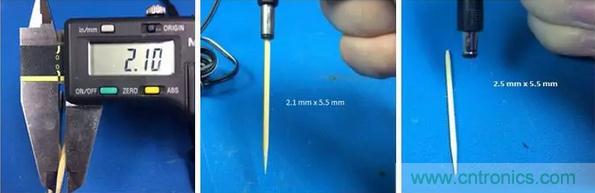 顯然,用一把尺子或者游標(biāo)卡尺(如果手邊有的話)來(lái)準(zhǔn)確測(cè)量或辨別2.1mm或者2.5mm的小孔內(nèi)徑是很難的。這就留給我們兩個(gè)選擇: