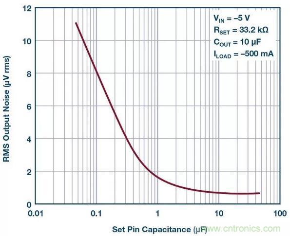 LT3094需要一個(gè)輸出電容才能保持穩(wěn)定性。鑒于其高帶寬,建議使用低ESR和ESL的陶瓷電容。為達(dá)到穩(wěn)定性,要求輸出電容最小值為10μF,ESR小于30mΩ,ESL小于1.5 nH。由于使用單個(gè)10μF陶瓷輸出電容可獲得高PSRR、低噪聲性能,而較大的輸出電容值僅僅略微提高了性能,因?yàn)榉€(wěn)壓器帶寬隨著輸出電容的增加而降低,因此,使用比最小輸出電容值10μF更大的輸出電容并不會(huì)獲得多大的收益。盡管如此,較大的輸出電容值確實(shí)會(huì)降低負(fù)載瞬變期間的峰值輸出偏差。