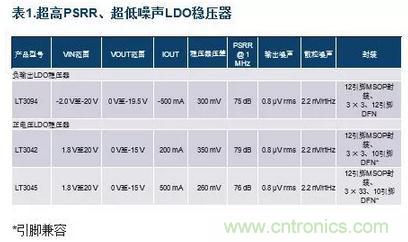 表1所示為ADI的超高PSRR、超低噪聲系列LDO穩(wěn)壓器的產(chǎn)品成員。