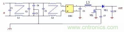 在0.15MHz~1MHz 的頻率范圍內(nèi),騷擾主要以共模的形式存在,在1MHz~10MHz 的頻率范圍內(nèi),騷擾的形式是差模和共模共存,在10MHz 以上,騷擾的形式主要以共膜為主。傳導(dǎo)發(fā)射的差模騷擾的產(chǎn)生主要是由于開(kāi)關(guān)管工作在開(kāi)關(guān)狀態(tài),當(dāng)開(kāi)關(guān)管開(kāi)通時(shí),流過(guò)電源線的電流線形上升,開(kāi)關(guān)管關(guān)斷時(shí)電流突變?yōu)?,因此流過(guò)電源線的電流為高頻的三角脈動(dòng)電流,含有豐富的高頻諧波分量,隨著頻率的升高,該諧波分量的幅度越來(lái)越小,因此差模騷擾隨頻率的升高而降低,另外,如下圖1 所示,由于電容C5 的存在,它與電感L3 組成低通濾波器,因此,差模傳導(dǎo)騷擾主要存在低頻率段。