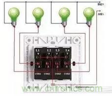 這樣的線路在電梯中常用,當然有時臥室改的細致一點,床左右都加上開關,門口再一個,也是單聯(lián)三控線路了。