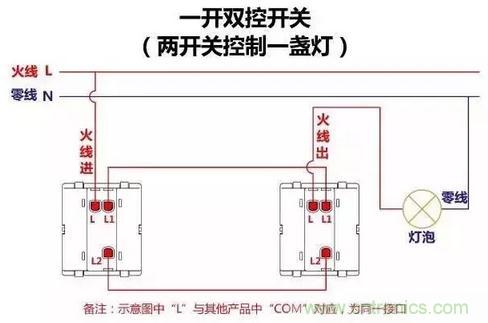 圖中L1、L11、L12是一組單開雙控開關,L2、L21、L22是另一組單開雙控開關,可知,三控開關其實是兩組單開雙控開關組合在一起的,如果我們在購買不到三控開關的情況下,我們可以購買雙開雙控(雙聯(lián)雙控)開關,然后用膠水(這個就很多了)把開關中間的縫隙粘起來,這樣就做成了單開三控開關了。下面是接線示意圖: