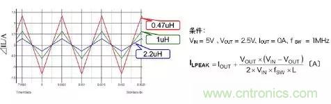 在這里,為加深對電感工作的理解,進一步說明電感值變化時電感電流如何變化的情形。下圖表示在相同工作條件下將電感值設為0.4μH、1μH、2.2μH時ILPEAK。
