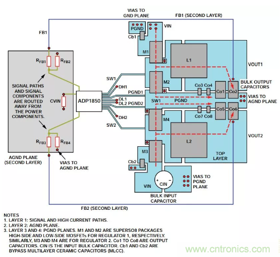 作為例子的開關(guān)調(diào)節(jié)器布局采用雙通道同步開關(guān)控制器 ADP1850,第一步是確定調(diào)節(jié)器的電流路徑。然后,進(jìn)行物理規(guī)劃和電源器件的考慮。此外,我們需要了解一點(diǎn):電流路徑?jīng)Q定了器件在該低噪聲布局布線設(shè)計(jì)中的位置。