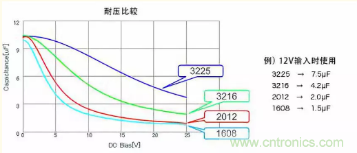 關(guān)于DC偏置,當(dāng)然須選擇影響少的,不過(guò)即使電容值、耐壓相同,變動(dòng)特性也會(huì)因封裝尺寸而異。下方圖表為其一例,顯示尺寸大者變動(dòng)少??傊?,請(qǐng)務(wù)必從電容器廠商取得充分的信息。