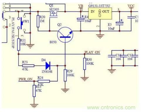 圖中電池的正電通過開關(guān)S1接到場效應管Q1的2腳源極,由于Q1是一個P溝道管,它的1腳柵極通過R20電阻提供一個正電位電壓,所以不能通電,電壓不能繼續(xù)通過,3v穩(wěn)壓IC輸入腳得不到電壓所以就不能工作不開機!這時,如果我們按下SW1開機按鍵時,正電通過按鍵、R11、R23、D4加到三極管Q2的基極,三極管Q2的基極得到一個正電位,三極管導通(前面講到三極管的時候已經(jīng)講過),由于三極管的發(fā)射極直接接地,三極管Q2導通就相當于Q1的柵極直接接地,加在它上面的通過R20電阻的電壓就直接入了地,Q1的柵極就從高電位變?yōu)榈碗娢唬琎1導通電就從Q1同過加到3v穩(wěn)壓IC的輸入腳,3v穩(wěn)壓IC就是那個U1輸出3v的工作電壓vcc供給主控,主控通過復位清0,讀取固件程序檢測等一系列動作,輸處一個控制電壓到PWR_ON再通過R24、R13分壓送到Q2的基極,保持Q2一直處于導通狀態(tài),即使你松開開機鍵斷開Q1的基極電壓,這時候有主控送來的控制電壓保持著,Q2也就一直能夠處于導通狀態(tài),Q1就能源源不斷的給3v穩(wěn)壓IC提供工作電壓!SW1還同時通過R11、R30兩個電阻的分壓,給主控PLAY ON腳送去時間長短、次數(shù)不同的控制信號,主控通過固件鑒別是播放、暫停、開機、關(guān)機而輸出不同的結(jié)果給相應的控制點,以達到不同的工作狀態(tài)!
