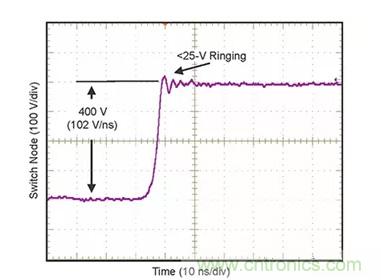 該芯片的壓擺率可達(dá) 100 伏/納秒 (ns) 且瞬時振蕩近乎為零(圖 3)。相比之下,傳統(tǒng)硅功率 MOSFET 的壓擺率典型值為 3 至10 V/ns。