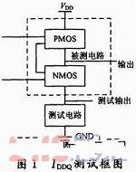 IDDQ測試是對功能測試的補充。通過測試靜態(tài)電流IDDQ可檢測出電路中的物理缺陷所引發(fā)的故障。IDDQ測試還可以檢測出那些尚未引起邏輯錯誤,但在電路初期會轉(zhuǎn)換成邏輯錯誤的缺陷。本文所設(shè)計的IDOQ電流測試電路對CMOS被測電路進行檢測,通過觀察測試電路輸出的高低電平可知被測電路是否有物理缺陷。測試電路的核心是電流差分放大電路,其輸出一個與被測電路IDDQ電流成正比的輸出。測試電路串聯(lián)在被測電路與地之間,以檢測異常的IDDQ電流。