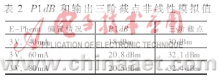 對于非線性模擬,常以諧波平衡模擬(HB)來實(shí)現(xiàn)。非線性模擬方法HB計(jì)算速度快,能夠處理分布元件和分立元件的電路,并很容易與更高階諧波及互調(diào)元件相容。ATF-54143管的P1dB和OIP3模擬非線性模型是基于W.R.Curtice模型,這個(gè)模型可以非常近似地模擬直流和小信號工作狀態(tài)(包括噪聲),對于截點(diǎn)的模擬則做出模擬預(yù)測結(jié)果比實(shí)際值要偏低。P1dB和OIP3的值如表2 所示:當(dāng)平衡LNA放大器的OIP3模擬結(jié)果為32.1dBm時(shí),P1dB則為20.8dBm,P1dB的模擬結(jié)果與實(shí)際的測量結(jié)果很接近,而OIP3的模擬結(jié)果則偏低,實(shí)際的測量結(jié)果達(dá)到37dBm。