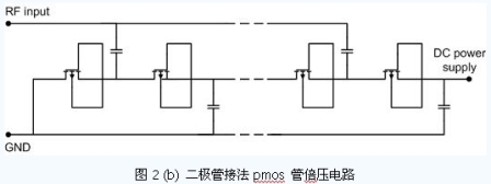 無(wú)源RFID 標(biāo)簽芯片工作時(shí)所需要的能量完全來(lái)源于讀卡器產(chǎn)生的電磁波的能量,因此,電源恢復(fù)電路需要將標(biāo)簽天線(xiàn)感應(yīng)出的超高頻信號(hào)轉(zhuǎn)換為芯片工作需要的直流電壓,為芯片提供能量。本文第2 部分將介紹電源恢復(fù)電路的設(shè)計(jì)。由于RFID 標(biāo)簽所處的電磁環(huán)境是十分復(fù)雜的,輸入信號(hào)的功率可以變化幾百甚至幾千倍,因此,為了芯片在大小不同的場(chǎng)強(qiáng)中均可以正常工作,必須設(shè)計(jì)可靠的電源穩(wěn)壓電路。本文第3部分將對(duì)電源穩(wěn)壓電路的設(shè)計(jì)進(jìn)行說(shuō)明。調(diào)制與解調(diào)電路是標(biāo)簽與讀卡器進(jìn)行通信的關(guān)鍵電路,目前絕大部分的UHF RFID 標(biāo)簽采用的是ASK調(diào)制,本文在第4 部分對(duì)調(diào)制與解調(diào)進(jìn)行介紹。RFID 標(biāo)簽的控制單元是處理指令的數(shù)字電路。為使標(biāo)簽在進(jìn)入讀卡器場(chǎng)區(qū)后,數(shù)字電路可以正確復(fù)位,以響應(yīng)讀卡器的指令,必須設(shè)計(jì)可靠的啟動(dòng)信號(hào)產(chǎn)生電路,用來(lái)提供數(shù)字單元的復(fù)位信號(hào)。本文在第5 部分將討論啟動(dòng)信號(hào)產(chǎn)生電路的設(shè)計(jì)。