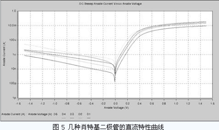 圖4 所示是在UMC 0.18um CMOS 工藝下設(shè)計(jì)的幾種肖特基二極管的版圖。它們的直流特性測(cè)試曲線(xiàn)如圖5 所示。從直流特性的測(cè)試結(jié)果