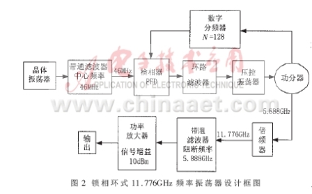 在該頻率振蕩器系統(tǒng)中,利用高穩(wěn)定晶體振蕩源輸出信號經過中心頻率為46MHz帶通濾波器,提供一個高精確的穩(wěn)定參考信號至檢相器,鎖相環(huán)路分頻計數(shù)器設置為128,達到鎖相后VCO輸出5.888GHz固定點頻信號,再經過高頻電路倍頻獲得11.776GHz的二次諧波。由于采用的倍頻器基波抑制性能較差,需要通過阻帶濾波和功率放大獲得足夠功率的高穩(wěn)定低相位噪聲的高純度11.776GHz振蕩信號。圖2為整個頻率振蕩器系統(tǒng)的設計框架。