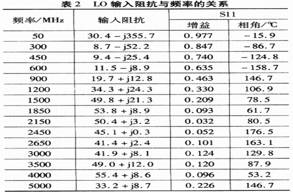 頻率大于1.2 GHz時(shí),盡管放大器提供的功率有幾個(gè)dB,但最佳LD驅(qū)動(dòng)功率只有-3 dBm(I/0輸入功率變化,混頻器性能不變);在頻率低于1.2GHz的情況下,盡管-3 dBm的L0驅(qū)動(dòng)功率仍然提供高轉(zhuǎn)化增益和線性,但是為了得到最佳噪聲,LO驅(qū)動(dòng)功率為0 dBm。自定義匹配網(wǎng)絡(luò)的阻抗數(shù)據(jù)見表2,并參考LO端沒有匹配時(shí)的情況。