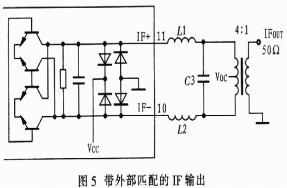 圖3示出由混合變壓器構(gòu)成的lF匹配電路,以達(dá)到最低LO-IF泄漏和最寬的IF帶寬。圖4示出由1個(gè)離散的IF不平衡變壓器代替IF變壓器的電路,以降低成本和縮小尺寸,盡管離散的IF不平衡變壓器也有較理想的噪聲系數(shù)、線性度及較高的轉(zhuǎn)換增益,但是LO-IF泄漏降低,IF的帶寬減小。
