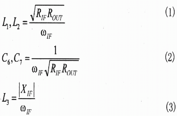 在許多應(yīng)用中,可以用離散IF不平衡變壓器代替IF變壓器,如圖4所示。Ll、L2、C6和C7的值可用式(1)、式(2)計(jì)算,在IF頻率期望值上得到 180°相移,并提供50Ω的單端輸出。電感器L3的值也可計(jì)算,但L3抵消內(nèi)部2.5pF的電容器,L3也為IF+端提供偏置電壓。低功耗多層片式電感適合Ll、L2,為了得到最大轉(zhuǎn)換增益以及為IF+端提供最小DC電壓,L3選用高Q值線繞片式電感器,C3是DC的隔離電容器。