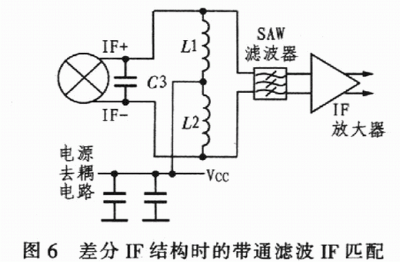 對(duì)整個(gè)差分IF結(jié)構(gòu)來說,還可以從另一個(gè)角度考慮,不用IF變壓器,如圖6所示,這里,混頻器的lF輸出匹配直接通過1個(gè)SAW濾波器,混頻器IF端的電源由IF匹配網(wǎng)絡(luò)中的電感器提供。計(jì)算Ll、L22和C3的值,使之在期望的IF頻率上諧振,并獲得高品質(zhì)因數(shù)和理想帶寬。調(diào)整L和C值,以消除混頻器內(nèi)部2.5 pF電容和SAW濾波器輸入電容的影響。在這種情況下,由于帶通網(wǎng)絡(luò)不變換阻抗,其差分lF輸出阻抗是400Ω。若SAW濾波器的輸入阻抗大于或小于 400 Ω,就需要附加匹配元件。