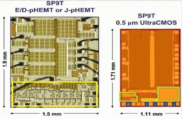 隨著多頻段手機(jī)越來(lái)越流行,對(duì)高集成度、小型天線開關(guān)的需求也越來(lái)越迫切。UltraCMOS SP7T開關(guān)現(xiàn)在已經(jīng)開始批量生產(chǎn),SP9T也在2007年底投入批量生產(chǎn)。在外形方面,GaAs SP7T為1.6x1.5mm,而采用SOS工藝SP7T開關(guān)只有1.2x1.0mm,面積縮小了一半。目前的GaAs E/D pHemt或J-pHemt SP9T開關(guān)外形尺寸為1.9x1.5mm。與之相比,采用UltraCMOS 0.5μm工藝制造的SP9T外形尺寸為1.7x1.1mm(圖3),它不需要片外ESD器件和性能增強(qiáng)匹配器件。UltraCMOS發(fā)展規(guī)劃預(yù)計(jì)0.25μm版本的SP9T尺寸將達(dá)到1.32x1.29mm。