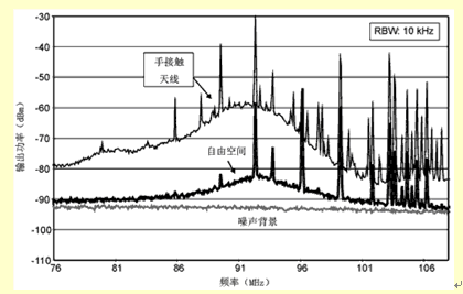 最后,要注意人體對小天線在FM調(diào)頻頻帶的增益的影響是正面的,尤其是使用者的身體與天線或者底板接觸的情況下。這是因為,在100MHz左右,人體是效率相當好的天線,半波長是1.5m左右。圖3給出了人體接觸天線和沒有接觸天線時,接收天線的輸出頻譜。很明顯,用手接觸天線時,G/T提高了10~15dB。由于大多數(shù)使用者在聽電話時和移動電話是靠得很近的,所以可以合理地假定,F(xiàn)M調(diào)頻天線的實際性能優(yōu)于它處在自由空間時的性能。