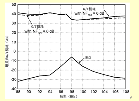 由現(xiàn)場測試可知,在接收FM調(diào)頻信號時,ActivvTM有源天線的性能相當于耳機連接線型天線,雖然這兩種天線的尺寸有很大差別。考慮到有源天線的體積小,它的幅射電阻大約只有1mΩ,而寄生損失電阻至少有1Ω左右,增益在-30~-50dBi的范圍內(nèi)。對于大多數(shù)RF工程師來講,這樣的增益是很難接受的。但是有一個因素極大地放寬了接收FM調(diào)頻信號時對增益的要求,即很高的環(huán)境噪聲溫度。圖8是一個消聲室(為了得到保守的估計)在屏蔽裝置拿走后的噪聲電平。大多數(shù)無線系統(tǒng)工作在頻率高于1GHz的范圍,環(huán)境噪聲接近室溫,增益為-10dBi,相當于信噪比降低了10dB,在FM頻段內(nèi),在城市的大部分地區(qū),由于人為噪聲的影響,噪聲電平高了大約20dB(對于調(diào)幅會更高)。因此,與完美的雙極電線相比,效率差的天線收到的信號較弱,噪聲較小。圖9給出了增益不同(0、-20、-40dB)的三種天線不同噪聲溫度時的G/T值。所有三種天線都接到噪聲指數(shù)為6dB的接收器上。對于增益為-40dB的實際天線(在室溫下G/T值減少46dB),當情況相同時,在23.000K的典型溫度下性能提高了19dB。對于有源天線,通過壓制接收器的噪聲指數(shù),可以把性能再提高6dB。所以,從信噪比方面看,增益為 -40dB的無源天線,只比完美的雙極天線差27dB。