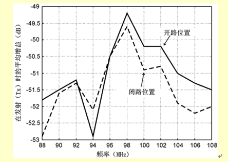 在發(fā)射時,發(fā)射元件起標準的無源天線作用,它用一個單刀單擲(SPST)通斷控制進行連接(見圖4)。前置放大器處在Rx狀態(tài),仍然與天線連接(但是切斷電源)。用一個內(nèi)阻為50Ω的信號源供給信號時,失配的半圈天線的增益測定值如圖7所示。寬帶范圍的平均增益(或者效率)達到-53~-49dB。在開關和調(diào)頻發(fā)射組件之間接入一個匹配網(wǎng)絡,或者選擇適當?shù)墓Ψ泡敵鲎杩梗敲磳敵龉β实囊罂梢苑艑捄芏唷?br />