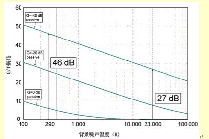 在實際應用中,除了受天線特性的影響,有兩個外來的因素會影響G/T損失的數(shù)值:接收器的噪聲指數(shù)和環(huán)境噪聲溫度Ta。接收器的噪聲指數(shù)會增大天線的輸出噪聲Tout(因而降低G/T),環(huán)境噪聲溫度也會增大輸出噪聲。