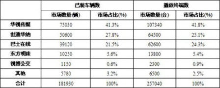 2008年,中國車載公交視聽系統(tǒng)市場品牌競爭格局中,華視傳媒憑借其強(qiáng)大的采用數(shù)字移動電視技術(shù)的聯(lián)播網(wǎng)以及其靈活獨(dú)特的合作模式,成為中國車載公交視聽系統(tǒng)市場已裝車輛和播放終端兩大指標(biāo)的市場第一,緊隨其后的是世通華納和巴士在線,東方明珠由于主要局限于上海市場,市場排名為第四。作為地方的車載視聽系統(tǒng)運(yùn)營商視博公交,則完全局限于杭州本土市場發(fā)展。DMG集團(tuán)公司,由于更加集中于地鐵視頻廣告的運(yùn)營和推廣,在全國的整體實(shí)力上,還不足以顛覆目前的格局。