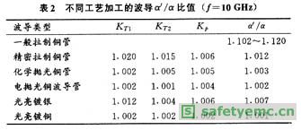 由Benson和AILison對各種不同工藝加工的口徑為25.4mm×12.7mm銅波導管,測出KT1,KT2,Kp之后,據(jù)上式算出的α′/α之值見表2[1]。[page]