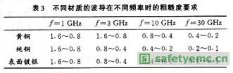 波導表面粗糙度越低,加工難度越大,制造成本也越高。為了降低成本、提高經(jīng)濟效益,在不同頻段,控制波導管表面粗糙度的要求是不同的。頻率越高,波長越小,粗糙度值要求也越低。表3為實際工作中總結(jié)出的銅、黃銅、鍍銀波導在不同頻率時的粗糙度要求,可作為設(shè)計時的依據(jù)。