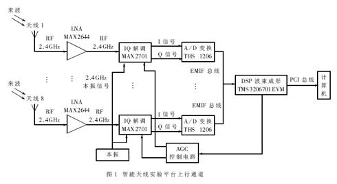 為了開展智能天線技術(shù)研究,結(jié)合實(shí)際情況,筆者設(shè)計(jì)了一個(gè)基于TI公司TMS320C6701數(shù)字信號(hào)處理器的智能天線實(shí)驗(yàn)平臺(tái)。該平臺(tái)采用8單元天線陣列,工作頻率為2.4GHz,采樣速率為1.5MHz,采用TI公司的TMS320C6701EVM作為數(shù)字波束成形和控制算法實(shí)現(xiàn)單元,用于在實(shí)際信號(hào)環(huán)境下智能天線控制算法測(cè)試、MIMO技術(shù)研究和其他陣列信號(hào)處理技術(shù)的研究。實(shí)驗(yàn)平臺(tái)的上行通道如圖1所示,下行通道如圖3所示。