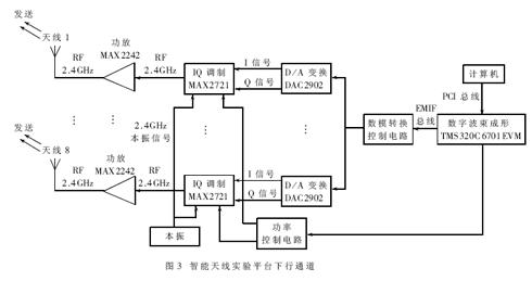 圖3給出智能天線實(shí)驗(yàn)平臺(tái)下行通道的框圖。待發(fā)送數(shù)據(jù)由計(jì)算機(jī)通過(guò)PCI總線傳給C6701EVM評(píng)估板,C6701DSP根據(jù)波束成形的需要生成各通道所需的數(shù)字基帶I/Q信號(hào);D/A變換器DAC2902把數(shù)字基帶I/Q信號(hào)變成模擬I/Q信號(hào),為了保持各通道信號(hào)的相位關(guān)系,各路D/A變換器采用統(tǒng)一的時(shí)鐘啟動(dòng)D/A變換,各路D/A變換器的控制信號(hào)由D/A變換控制電路產(chǎn)生;各通道模擬I/Q信號(hào)由零中頻I/Q調(diào)制器MAX2721上變頻到2.4GHz的射頻信號(hào),經(jīng)過(guò)功率放大器MAX2242放大后送到天線陣列輻射,形成下行波束;各通道I/Q調(diào)制器所需的本振信號(hào)由統(tǒng)一的信號(hào)源產(chǎn)生以保證各通道的相位關(guān)系;C6701EVM通過(guò)McBSP發(fā)送命令到功率控制電路產(chǎn)生控制信號(hào)到MAX2721的功率控制端,控制天線陣列的輸出功率。[page]