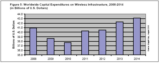圖5所示為iSuppli公司對2008-2014年全球無線基礎設施設備資本支出的預測。