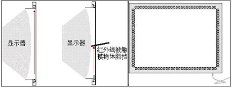 紅外觸摸屏是在緊貼屏幕前密布X、Y方向上的紅外線矩陣,通過(guò)不停的掃描是否有紅外線被物體阻擋檢測(cè)并定位用戶的觸摸。如下圖所示,這種觸摸屏是在顯示器的前面安裝一個(gè)外框,外框里設(shè)計(jì)有電路板,從而在屏幕四邊排布紅外發(fā)射管和紅外接收管,一一對(duì)應(yīng)形成橫豎交叉的紅外線矩陣。每掃描完一圈,如果所有的紅外對(duì)管通達(dá),綠燈亮,表示一切正常。
