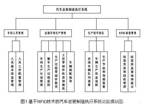 基于RFID技術(shù)的汽車總裝制造執(zhí)行系統(tǒng)功能模塊主要分為車間生產(chǎn)管理、生產(chǎn)線可視化、RFID標(biāo)簽管理、車間人員管理等四個(gè)功能模塊,具體功能結(jié)構(gòu)如圖1 所示: