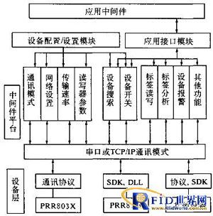 RFID技術(shù)的基本工作原理是:標(biāo)簽進(jìn)入磁場(chǎng)后,接收讀寫器發(fā)出的射頻信號(hào),憑借感應(yīng)電流所獲得的能量發(fā)送出存儲(chǔ)在芯片中的產(chǎn)品信息(Passive Tag,無源標(biāo)簽或被動(dòng)標(biāo)簽),或者主動(dòng)發(fā)送某一頻率的信號(hào)(Active Tag,有源標(biāo)簽或主動(dòng)標(biāo)簽):讀寫器讀取信息并解碼后,送至中央信息系統(tǒng)進(jìn)行有關(guān)數(shù)據(jù)處理。中間件是介于應(yīng)用系統(tǒng)和系統(tǒng)軟件之間的一類軟件,它使用系統(tǒng)軟件所提供的基礎(chǔ)服務(wù),銜接網(wǎng)絡(luò)上應(yīng)用系統(tǒng)的各個(gè)部分或不同的應(yīng)用,以達(dá)到資源共享、功能共享的目的.在具體實(shí)現(xiàn)上,中間件是一個(gè)用API定義的軟件層,具有強(qiáng)大的通信能力和良好的可擴(kuò)展性。