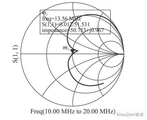 手動調(diào)諧即是交替不斷調(diào)整電容C1、C2 的值,同時觀察曲線變化,直到在所要求的頻率點S11等于0。圖2為某一天線電路在頻率在10~20MHz之間變化時,其反射系數(shù)的變化曲線,其中,標記13. 56MHz的點, S11值近似為0,達到了匹配要求。