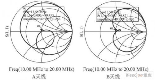 結(jié)果如圖7所示,對于A, B兩種天線的任何一種,都找到了最優(yōu)C1 和C2 的組合。當頻率為13. 56MHz時,兩類天線的反射系數(shù)雖然與0點都有一定的偏差,但其偏差都在可接受范圍之內(nèi)。