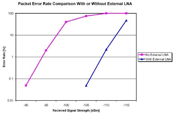 圖2:有/無外部LNA的低功耗無線接收機(jī)的誤包率對比。本例中實(shí)現(xiàn)了15dB的增益改善。