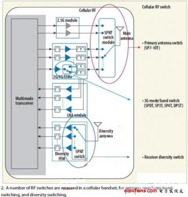 圖2:蜂窩手機(jī)中要求使用大量射頻開(kāi)關(guān),分別用于天線切換、頻段切換和分集切換。