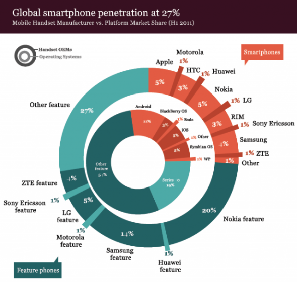 就智能手機市場領(lǐng)導(dǎo)者而言,當(dāng)前的競爭是在iPhone和Android之間展開的,原因是前手機行業(yè)領(lǐng)導(dǎo)者諾基亞對iPhone的出現(xiàn)反應(yīng)遲緩,因此在高端智能手機市場上所占份額正在穩(wěn)步下滑。諾基亞已決定從Symbian系統(tǒng)轉(zhuǎn)向Windows Phone系統(tǒng),這一決定不僅令三星、HTC、摩托羅拉、LG和索尼等Android廠商獲得優(yōu)勢,同時也令華為、中興、宏碁、戴爾和華碩等后來者受益。